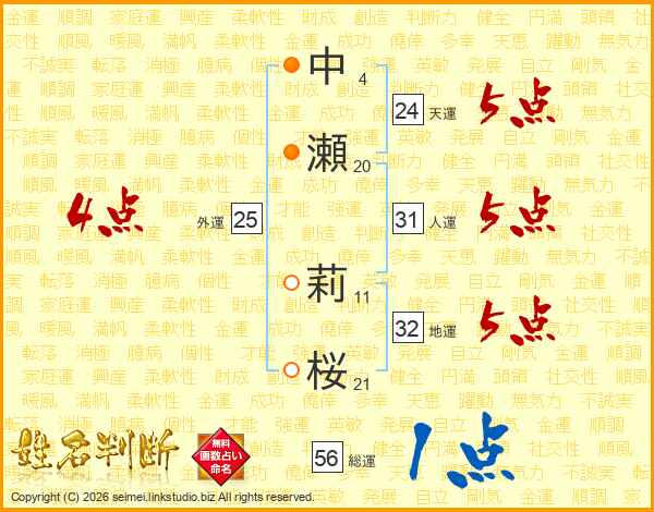 中(4画)瀬(20画) 莉(11画)桜(21画)