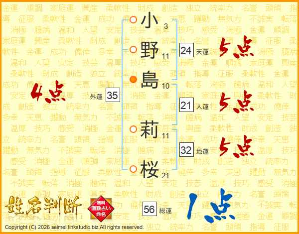 小(3画)野(11画)島(10画) 莉(11画)桜(21画)