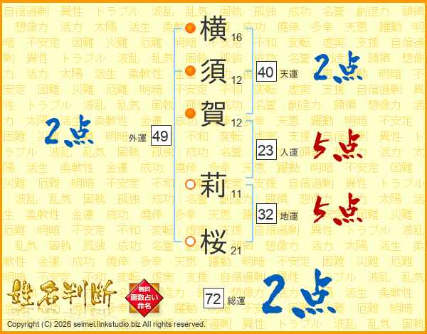 横(16画)須(12画)賀(12画) 莉(11画)桜(21画)