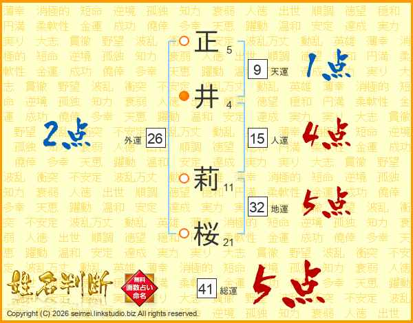 正(5画)井(4画) 莉(11画)桜(21画)