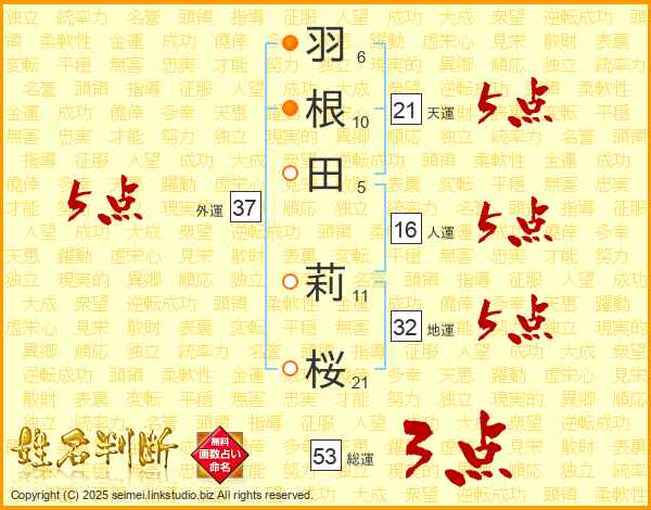 羽(6画)根(10画)田(5画) 莉(11画)桜(21画)