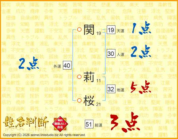 生活面を象徴する運勢です。外部から受ける影響力を表し、結婚運、家庭運や職場、環境への順応性を表します。総運から人運を引いた画数。姓や名が1文字の場合を除く。