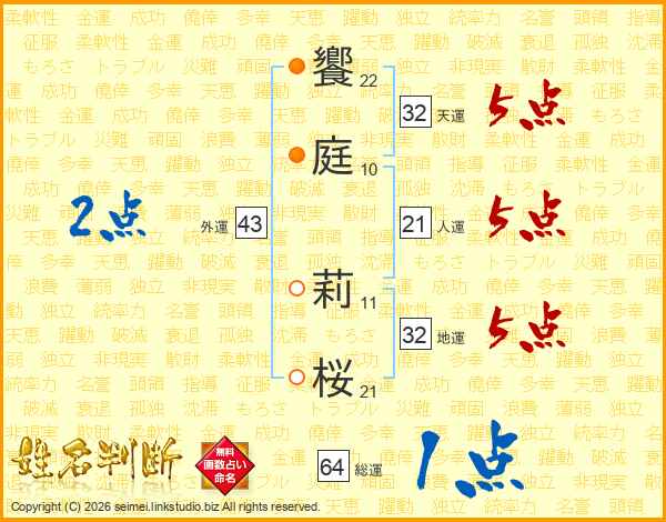 饗(22画)庭(10画) 莉(11画)桜(21画)