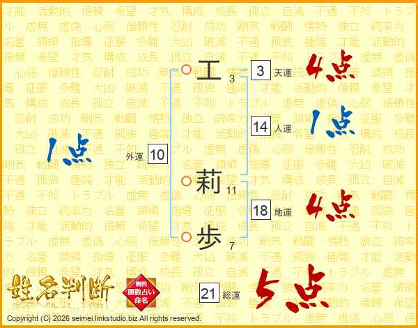 生活面を象徴する運勢です。外部から受ける影響力を表し、結婚運、家庭運や職場、環境への順応性を表します。総運から人運を引いた画数。姓や名が1文字の場合を除く。