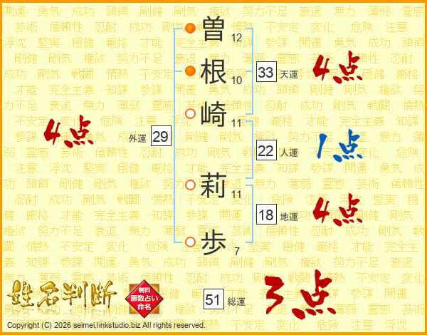 曽(12画)根(10画)崎(11画) 莉(11画)歩(7画)