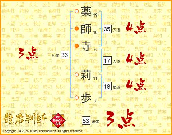 薬(19画)師(10画)寺(6画) 莉(11画)歩(7画)