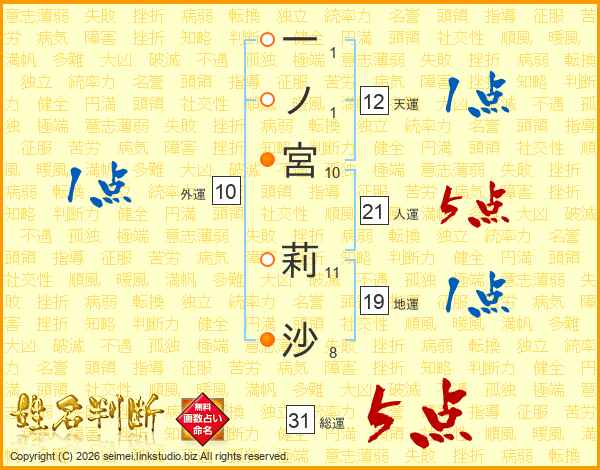 一ノ宮莉沙さんの総運は31画の5点!