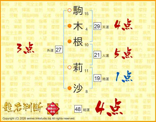 駒(15画)木(4画)根(10画) 莉(11画)沙(8画)
