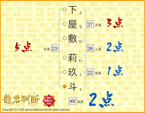 下(3画)屋(9画)敷(15画) 莉(11画)玖(7画)斗(4画)