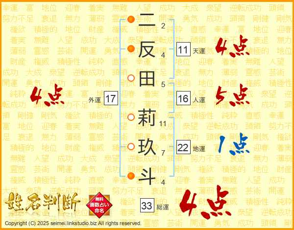 生活面を象徴する運勢です。外部から受ける影響力を表し、結婚運、家庭運や職場、環境への順応性を表します。総運から人運を引いた画数。姓や名が1文字の場合を除く。