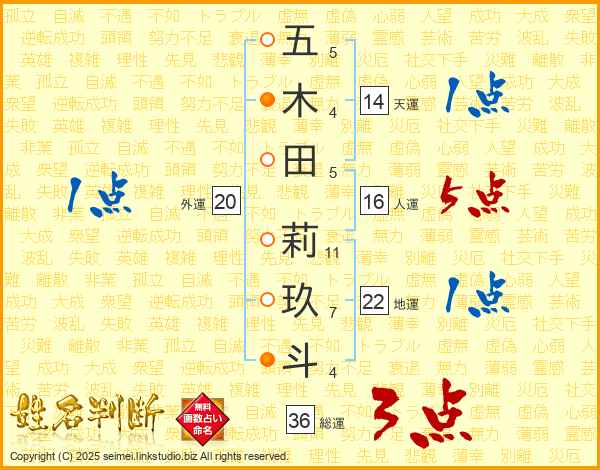 五(5画)木(4画)田(5画) 莉(11画)玖(7画)斗(4画)