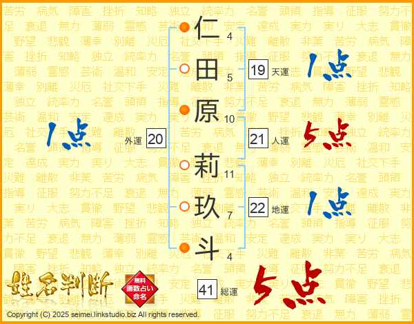 仁(4画)田(5画)原(10画) 莉(11画)玖(7画)斗(4画)