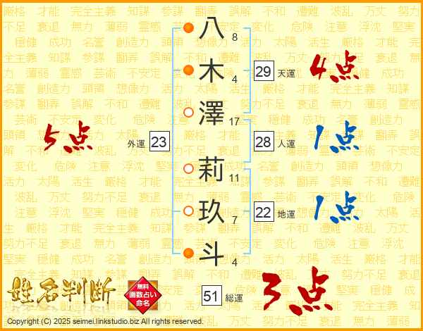 八木澤莉玖斗さんの天運は29画の4点!
