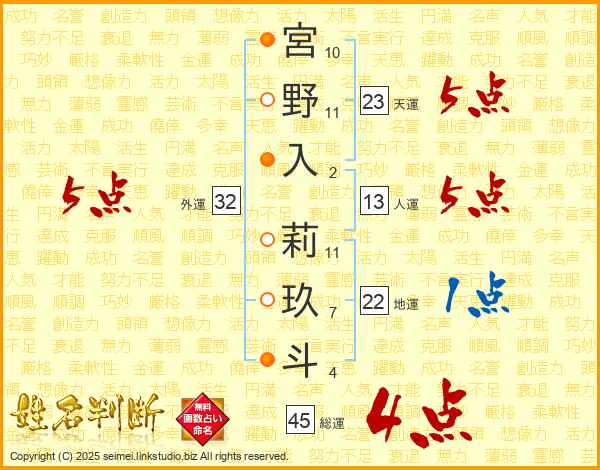 宮野入莉玖斗さんの外運は32画の5点!