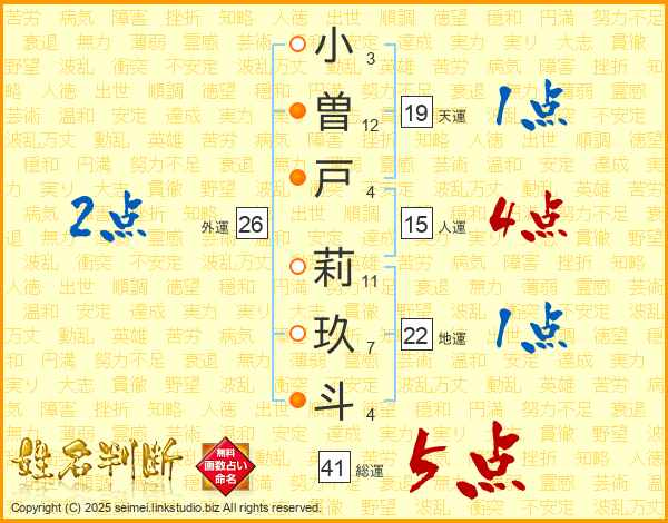 小(3画)曽(12画)戸(4画) 莉(11画)玖(7画)斗(4画)