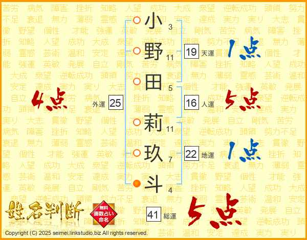 小(3画)野(11画)田(5画) 莉(11画)玖(7画)斗(4画)
