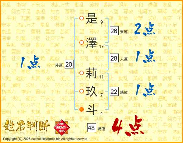 是(9画)澤(17画) 莉(11画)玖(7画)斗(4画)