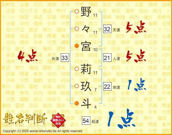 野々宮莉玖斗さんの総運は54画の1点!