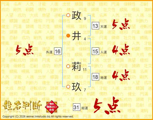 政(9画)井(4画) 莉(11画)玖(7画)