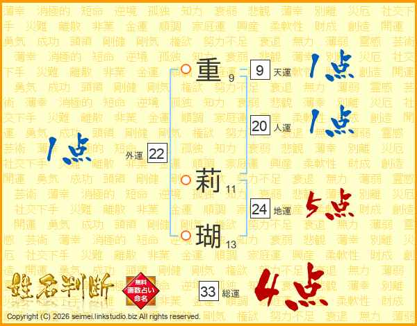 重莉瑚さんの総運は33画の4点!