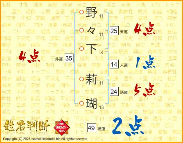 野(11画)々(11画)下(3画) 莉(11画)瑚(13画)