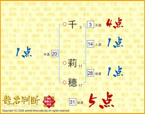 生活面を象徴する運勢です。外部から受ける影響力を表し、結婚運、家庭運や職場、環境への順応性を表します。総運から人運を引いた画数。姓や名が1文字の場合を除く。