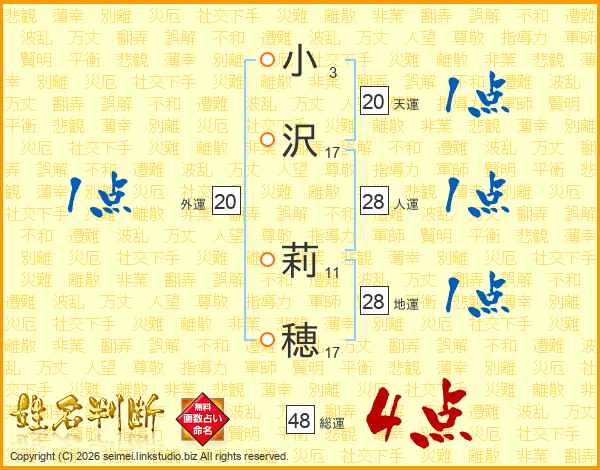 小(3画)沢(17画) 莉(11画)穂(17画)