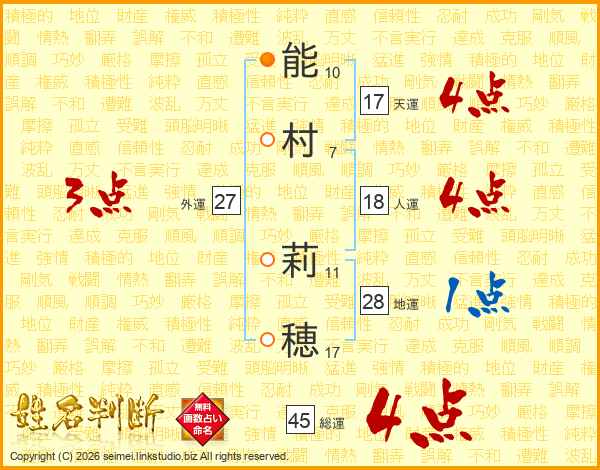 能(10画)村(7画) 莉(11画)穂(17画)