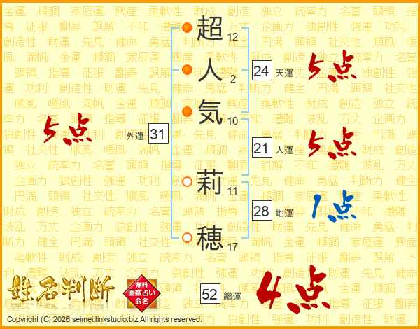 超(12画)人(2画)気(10画) 莉(11画)穂(17画)