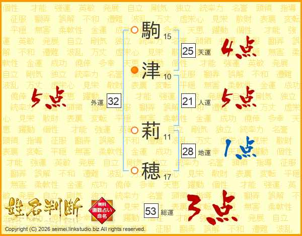 駒(15画)津(10画) 莉(11画)穂(17画)