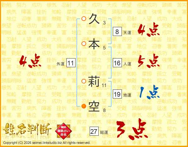 生活面を象徴する運勢です。外部から受ける影響力を表し、結婚運、家庭運や職場、環境への順応性を表します。総運から人運を引いた画数。姓や名が1文字の場合を除く。