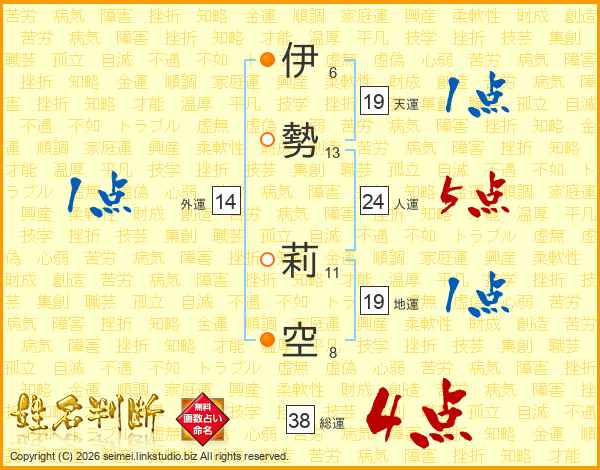 伊勢莉空さんの総運は38画の4点!
