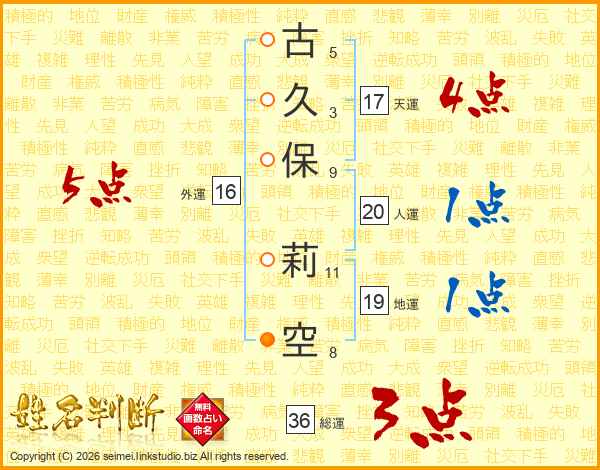 古(5画)久(3画)保(9画) 莉(11画)空(8画)