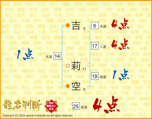 生活面を象徴する運勢です。外部から受ける影響力を表し、結婚運、家庭運や職場、環境への順応性を表します。総運から人運を引いた画数。姓や名が1文字の場合を除く。