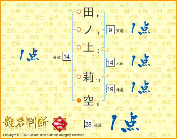 田(5画)ノ(1画)上(3画) 莉(11画)空(8画)