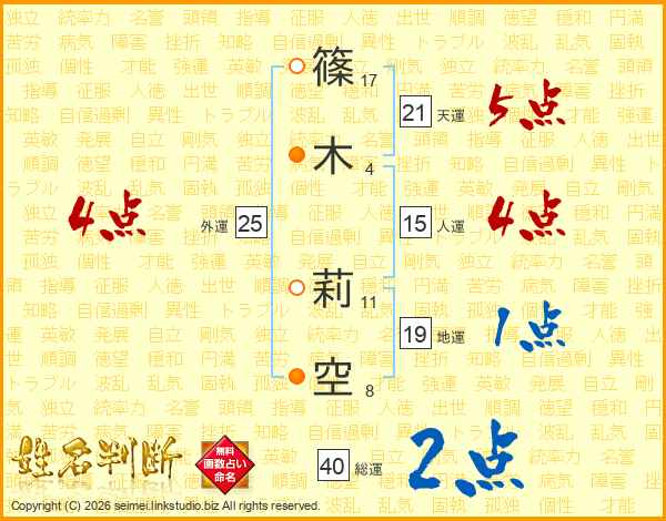生活面を象徴する運勢です。外部から受ける影響力を表し、結婚運、家庭運や職場、環境への順応性を表します。総運から人運を引いた画数。姓や名が1文字の場合を除く。