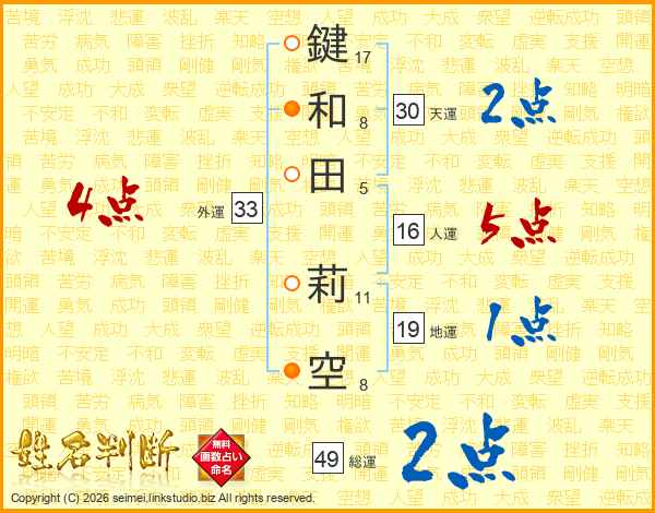 鍵(17画)和(8画)田(5画) 莉(11画)空(8画)