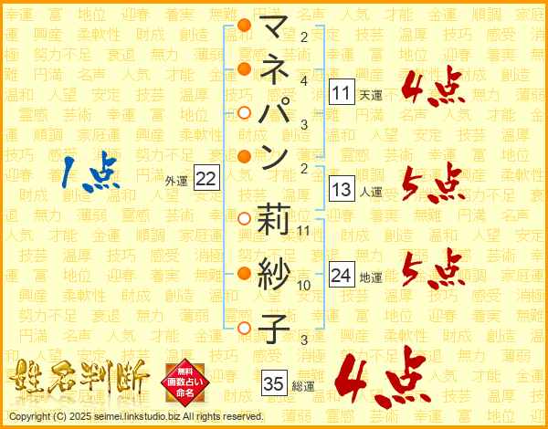 マ(2画)ネ(4画)パ(3画)ン(2画) 莉(11画)紗(10画)子(3画)