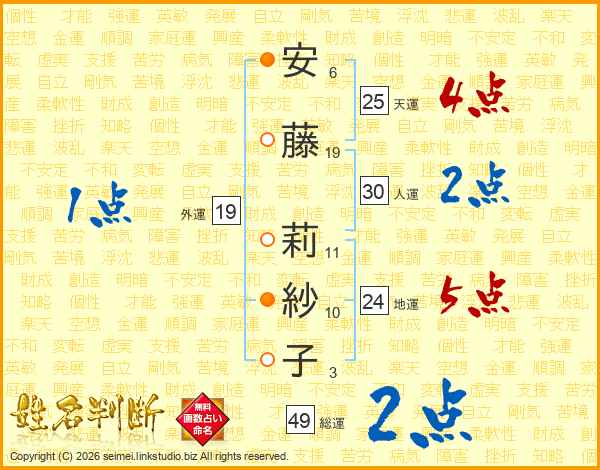 安(6画)藤(19画) 莉(11画)紗(10画)子(3画)