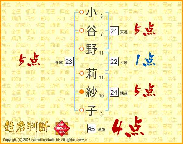 小(3画)谷(7画)野(11画) 莉(11画)紗(10画)子(3画)