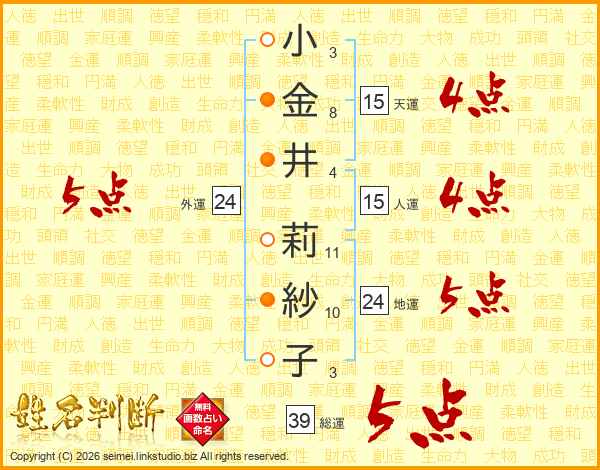 小金井莉紗子さんの総運は39画の5点!