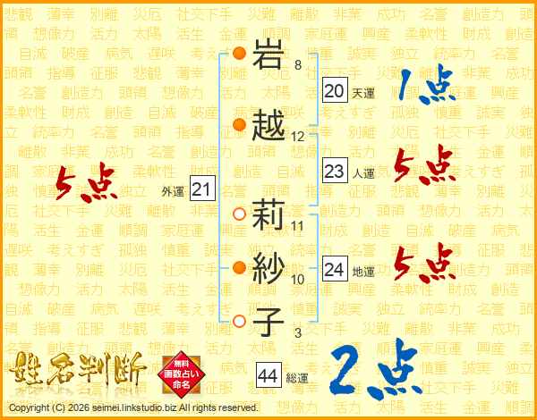 岩(8画)越(12画) 莉(11画)紗(10画)子(3画)