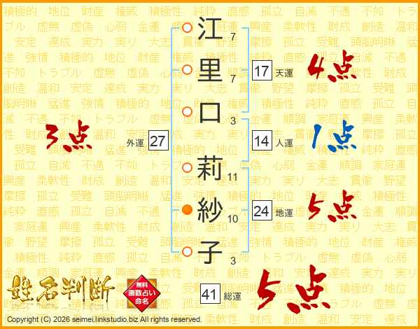 江(7画)里(7画)口(3画) 莉(11画)紗(10画)子(3画)