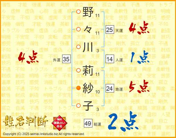 野々川莉紗子さんの総運は49画の2点!