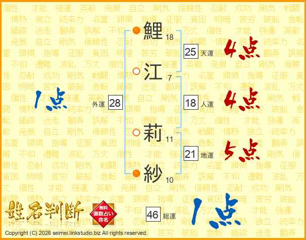 鯉(18画)江(7画) 莉(11画)紗(10画)