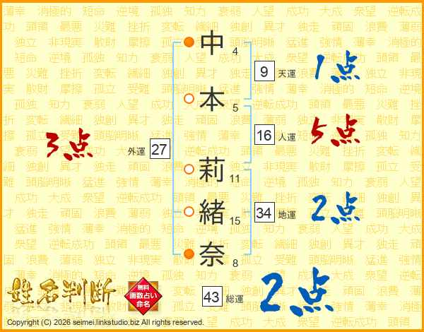 中本莉緒奈さんの総運は43画の2点!