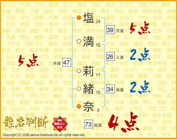 塩(24画)満(15画) 莉(11画)緒(15画)奈(8画)