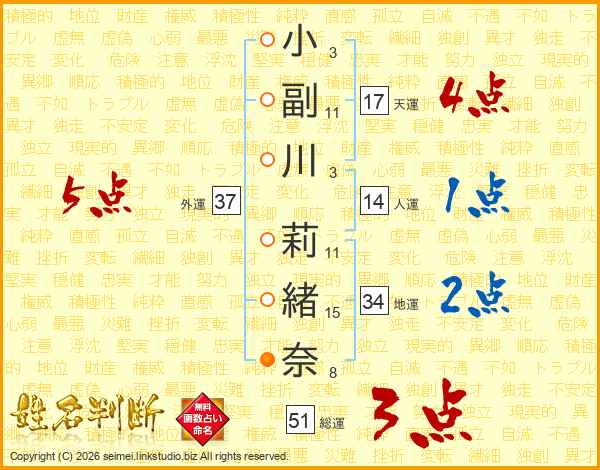 小(3画)副(11画)川(3画) 莉(11画)緒(15画)奈(8画)