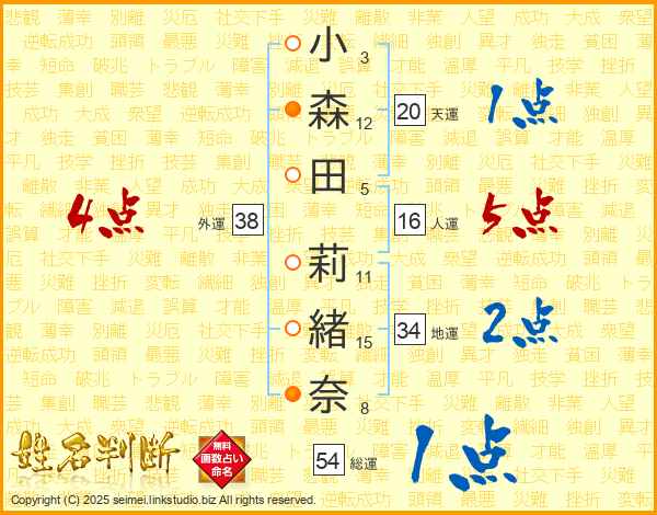 小(3画)森(12画)田(5画) 莉(11画)緒(15画)奈(8画)