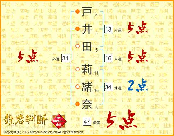 戸(4画)井(4画)田(5画) 莉(11画)緒(15画)奈(8画)